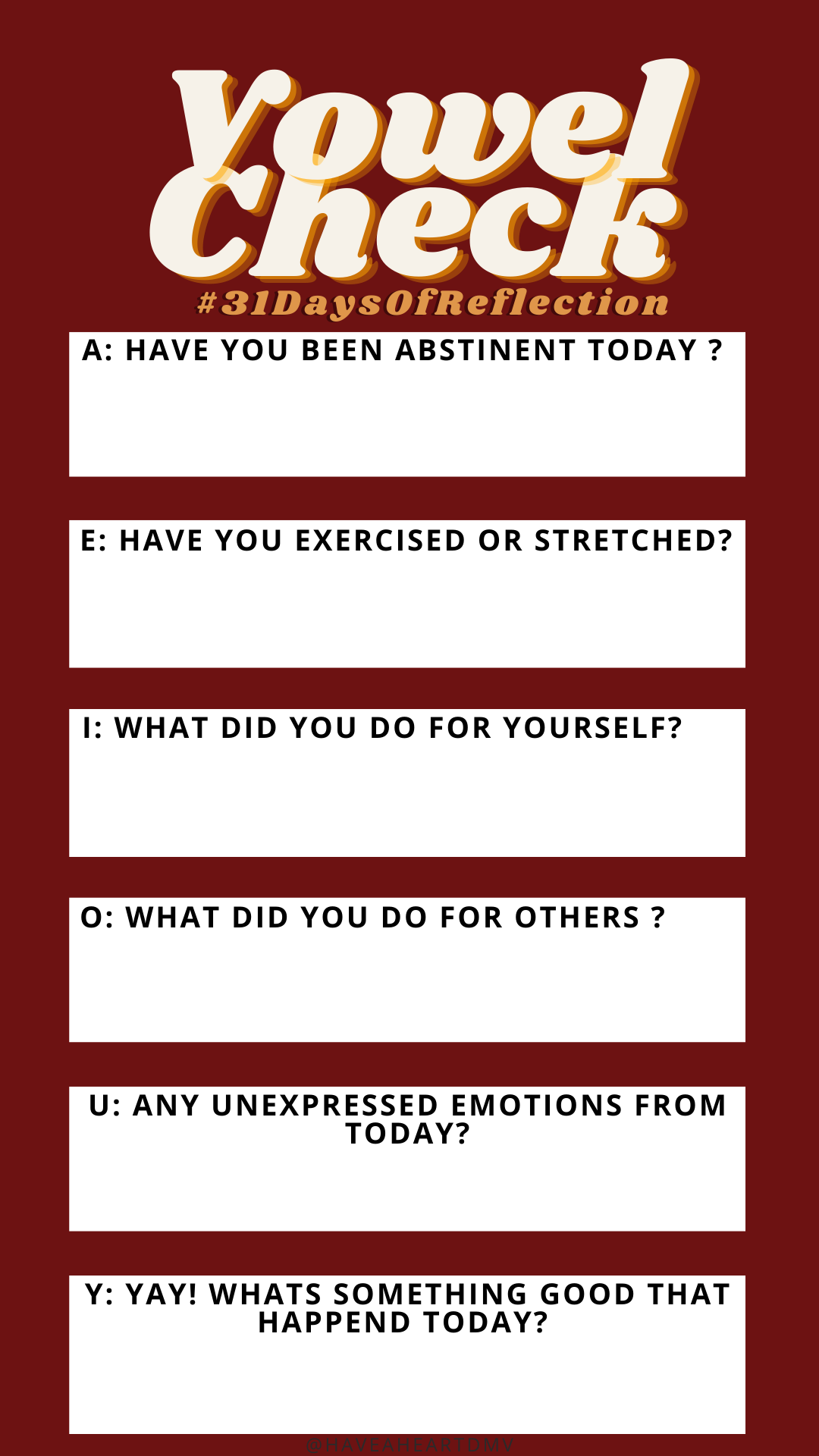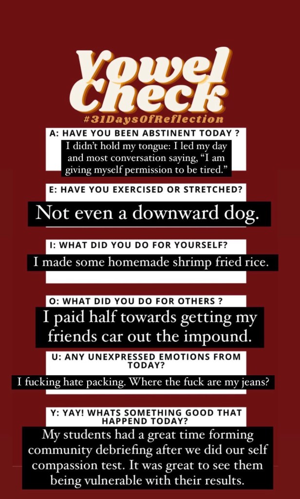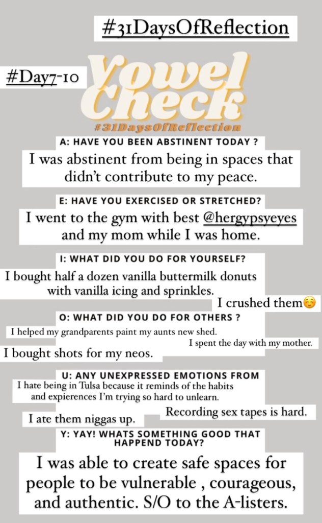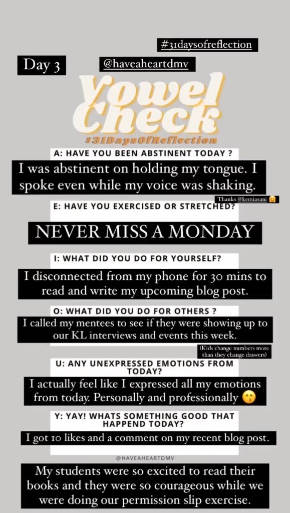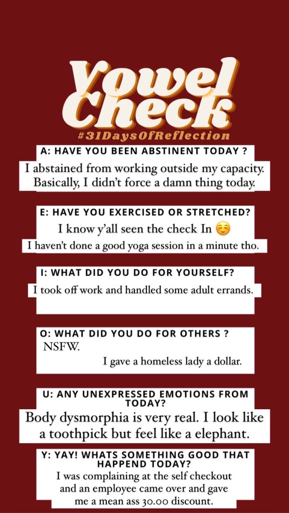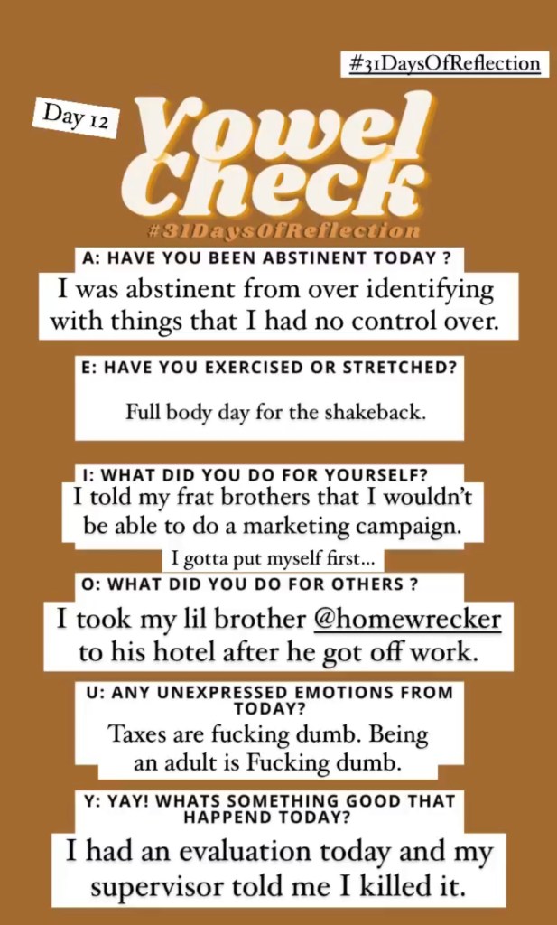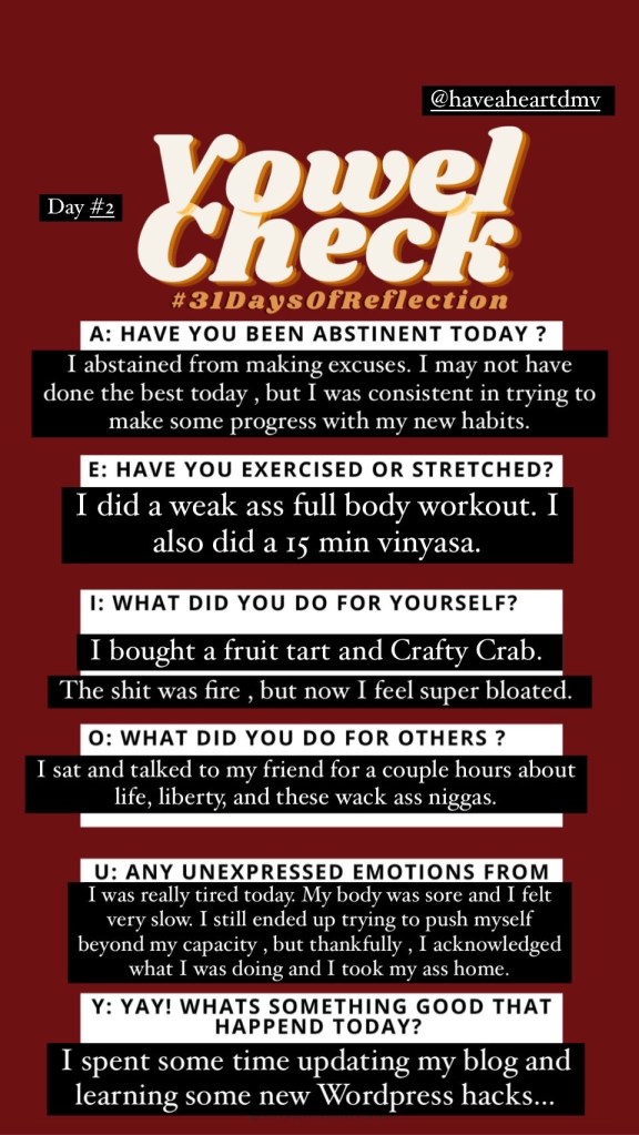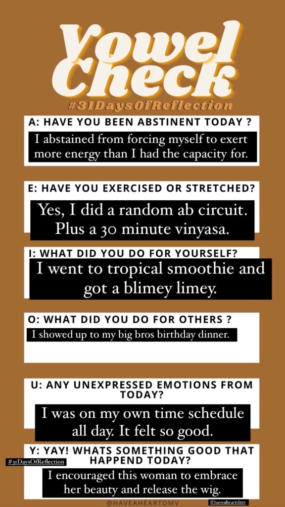 Join in on the journey as I track the next 31 days of self reflection. The goal is to upload my IG stories that have a completed and the blog post for the day. Click an image for the reflection post. Remember to follow us on IG for more up to date content.